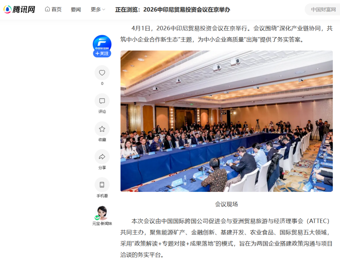 近日,由中国国际跨国公司促进会与亚洲贸易旅游与经济理事会(ATTEC)联合主办的2026中印尼贸易投资会议在北京成功举办,盛会引发中印尼两国媒体集体关注,成为双边经贸合作的重要风向标。