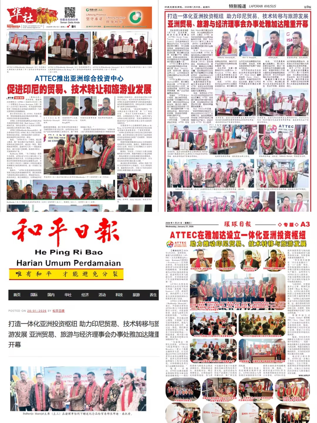 2026年1月19日,亚洲贸易、旅游与经济理事会(ATTEC)和熊猫印尼新总部落成庆典圆满落幕,这场汇聚印尼贸易部长、东盟商务中心主席、旅游部、雅加达中小企业部等很多重要政府部门,以及ATTEC主席等重磅嘉宾的行业盛会,《印度尼西亚商报》 《印度尼西亚日报》 《国际日报》 《印华日报》 《和平日报》《环球日报》,CNN电台等多家媒体电台争相报道,成为中印尼经贸合作深化的鲜活注脚。